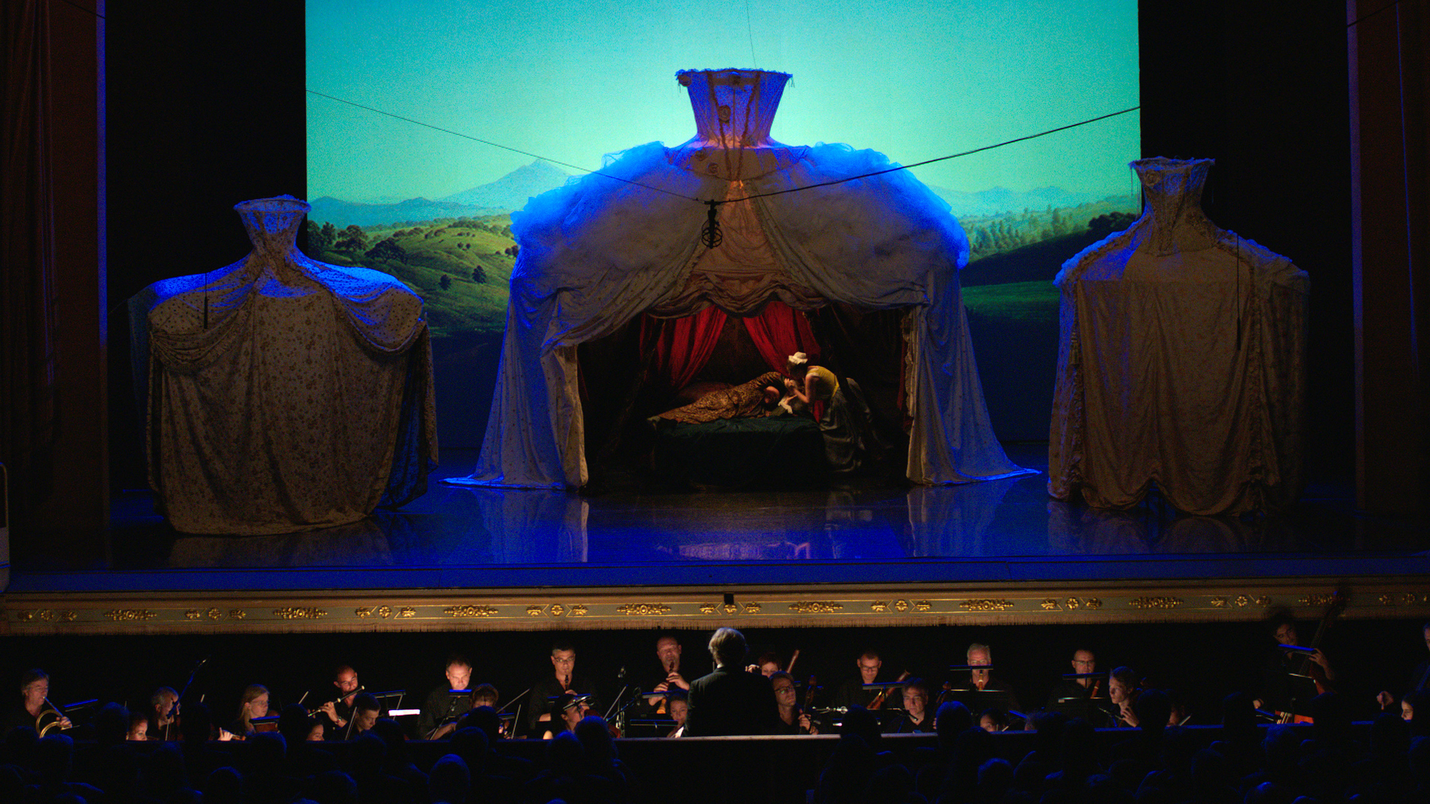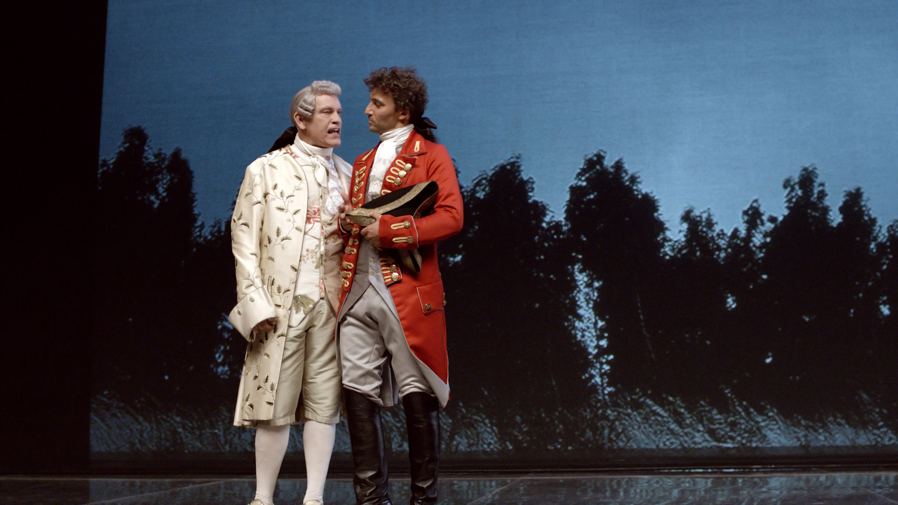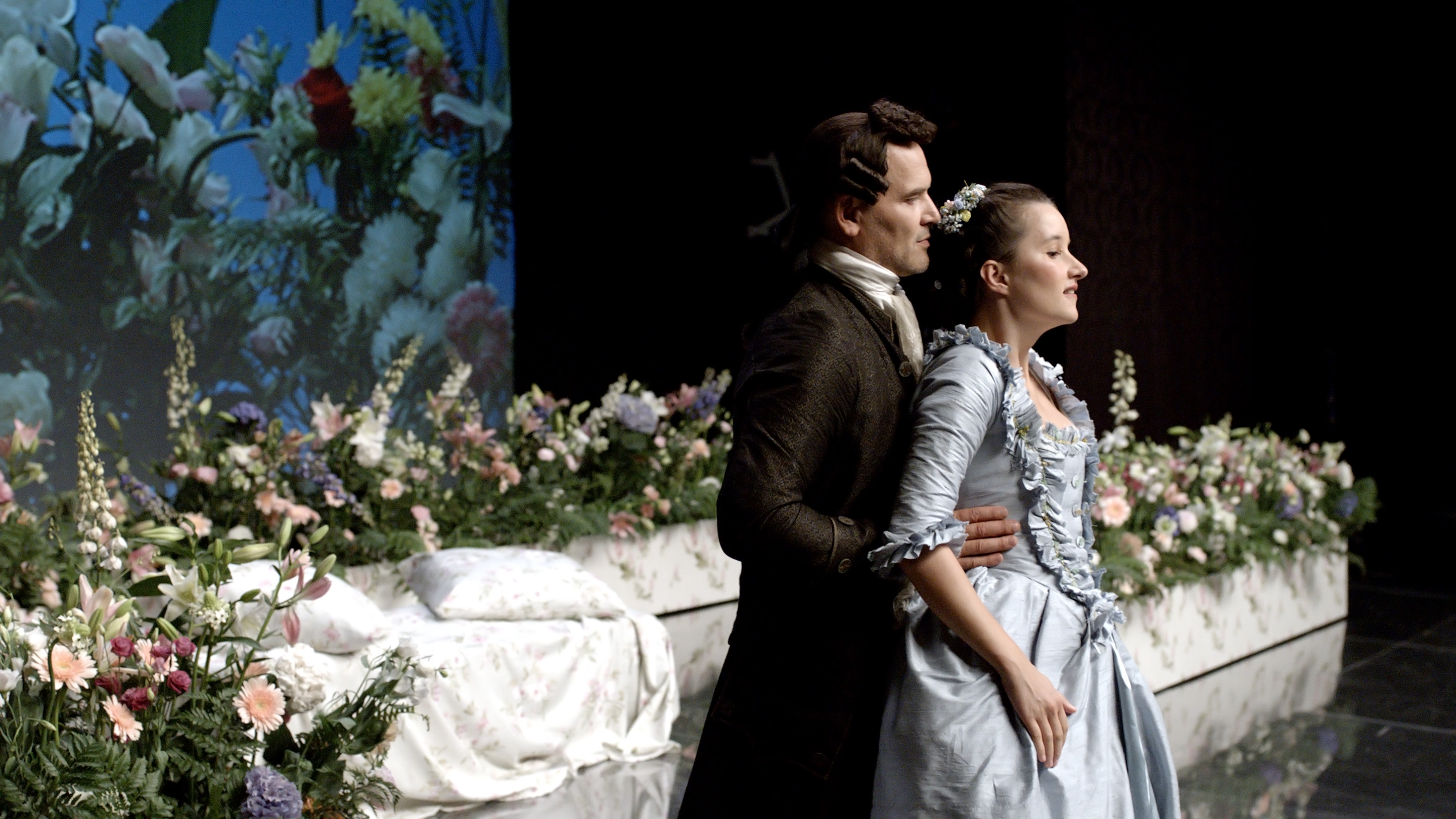 Pourtant, nous serons dans le jeu. Nous vivrons en un temps concentré des événements qui se sont étalés sur sept décennies, reconstitués à partir de souvenirs restitués ou inventés. Les chanteurs se mêleront aux acteurs, les décors du théâtre façonneront, les costumes transformeront, les voix enchanteront et, par-dessus tout, sonnera la musique la plus légère, la plus profonde, la plus intelligible qui soit. Et, sans transition perceptible, nous nous retrouverons complètement ailleurs, au XVIIIe siècle, dans un Château de Bohême, où nous assistons à la rencontre d’Elisa et de Giacomo.